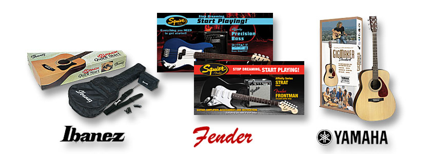In Stock Now: Strat Packs, P Bass Packs, J Bass Packs, Acoustic Guitar, & Classic Guitar Packs From Fender; Acoustic Guitar Packs & Classic Guitar Packs From Ibanez; Aoustic/Electric Guitar Packs From Epipiphone; & Gigmaker Guitar Packs From Yamaha.