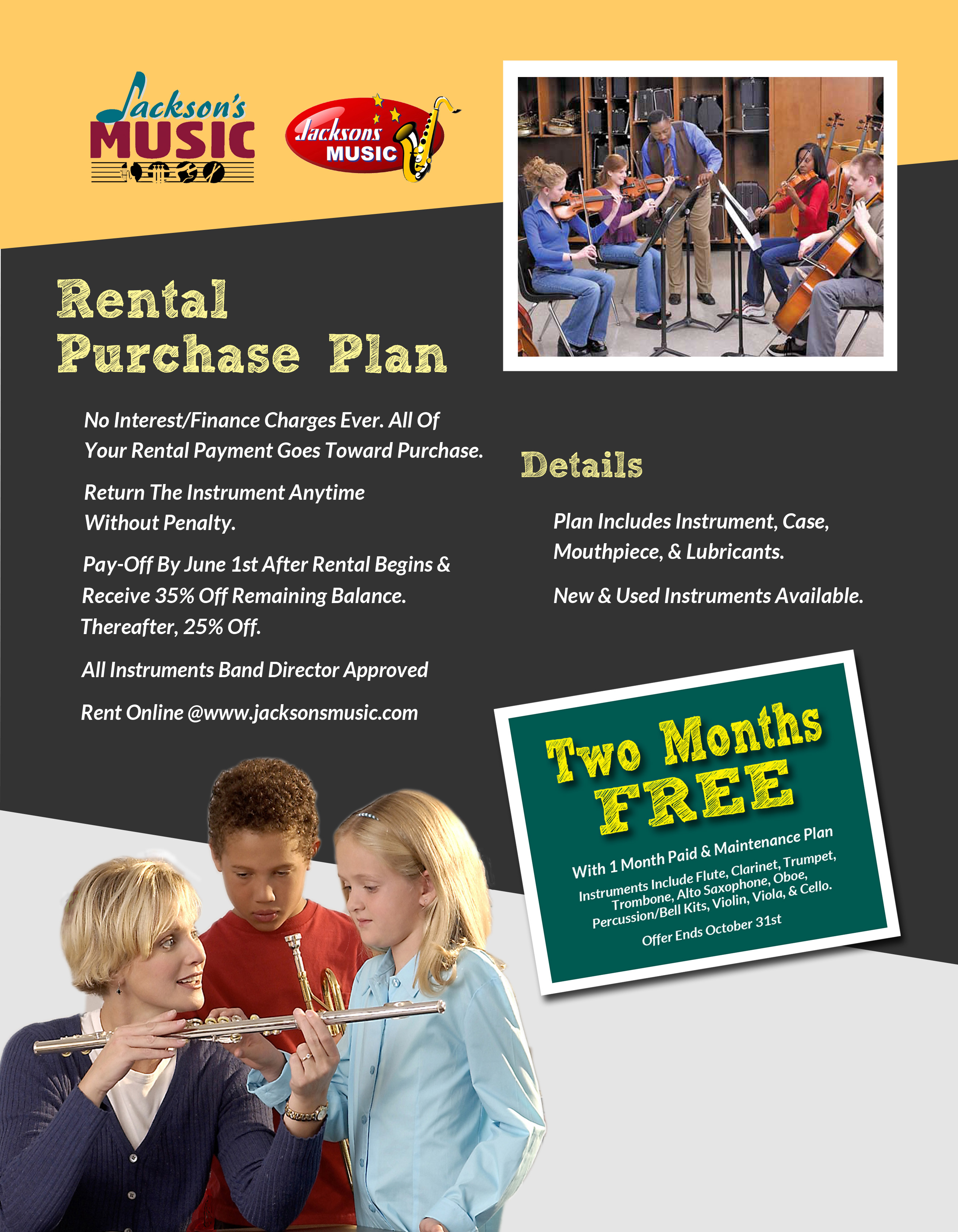 Jackson’s Music Store Will Repurchase The Instrument Anytime After Two Months Of Ownership. Repurchase Price Is The Purchase Price Less Jackson’s Normal Rental Fee For Each Month The Instrument Is Owned. A Fee For Damages Will Also Be Deducted.